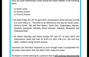 Blantyre Water Board has announced that it will conduct maintenance works in Lunzu, Ginnery Cor..